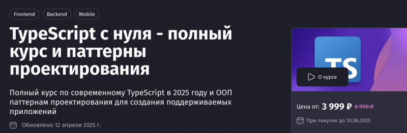Цена: 3999р. — Экономия от стоимости -83% Взнос: 660р. Складчина: TypeScript с нуля — полный...
